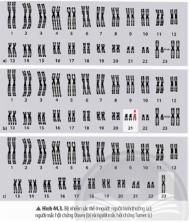 a) Sự khác nhau giữa bộ nhiễm sắc thể của người mắc hội chứng Down, Turner so với người bình thường: