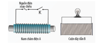 Sau khi công tắc điện K đóng thì trong cuộn dây dẫn B có xuất hiện dòng điện cảm ứng. Vì sao nguồn điện xoay chiều làm nam châm điện A thay đổi từ trường liên tục, từ đó làm thay đổi số đường sức từ quanh cuộn dây dẫn B, làm cuộn dây dẫn B xuất hiện dòng điện cảm ứng.