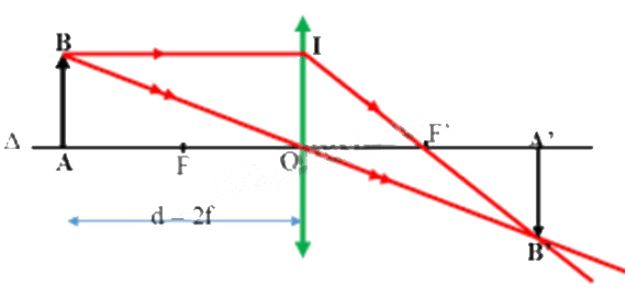 Câu hỏi trang 52 KHTN 9: Vật AB có độ cao h = 3 cm được đặt vuông góc trước một thấu kính hội tụ có tiêu cự f = 5 cm, điểm A nằm trên trục chính và cách thấu kính một khoảng d = 2f.