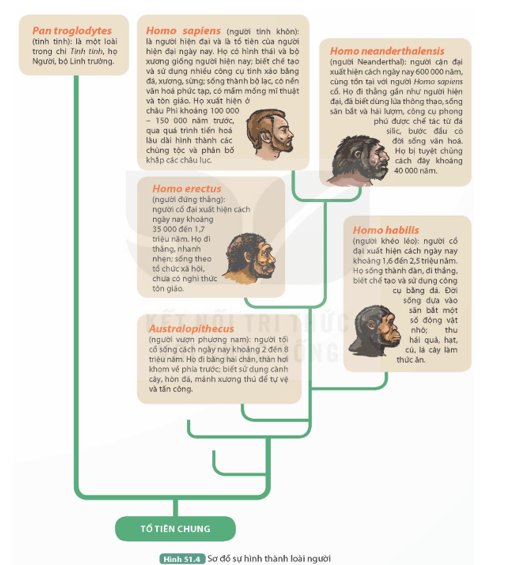 1. Các giai đoạn chính của quá trình phát sinh loài người lần lượt là: Từ tổ tiên chung tiến hóa thành người Australopithecus → Homo habilis → Homo erectus → Homo neanderthalensis và Homo sapiens.