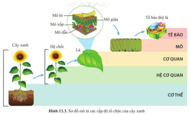 Quan sát hình 13.3 và nêu tên các cấp độ tổ chức của cơ thể cây xanh theo thứ tự từ thấp đến cao.