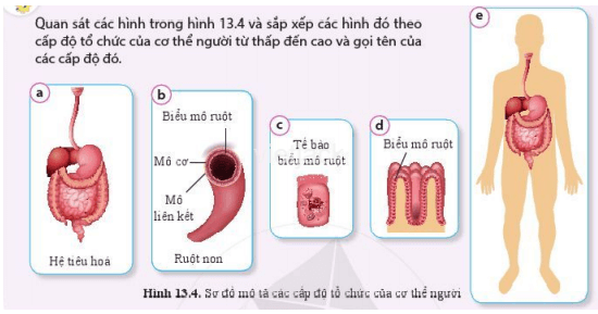 Quan sát các hình trong hình 13.4 và sắp xếp các hình đó theo cấp độ tổ chức của cơ thể người theo thứ tự từ thấp đến cao và gọi tên của các cấp độ đó.