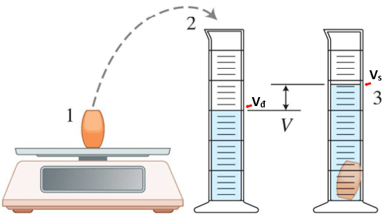 - Bước 2: Rót nước vào ống đong, thể tích nước đo được ban đầu là Vđ. Sau đó, thả vật vào ống đong, thể tích nước và vật rắn đo được là Vs.