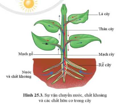 Quan sát hình 25.3 và đọc thông tin cho biết chất nào được vận chuyển trong mạch gỗ, chất nào được vận chuyển trong mạch rây?