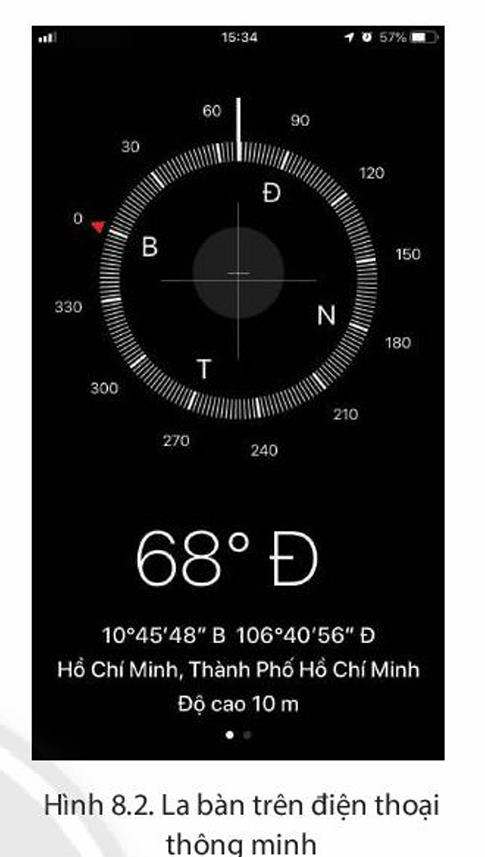 - Để xác định hướng cần tìm, ta mở ứng dụng la bàn, đặt điện thoại theo chiều đầu điện thoại quay về phía mà mình muốn biết phương hướng, sau đó giữ yên thiết bị. Kết quả trên màn hình sẽ hiển thị cho biết hướng nào.