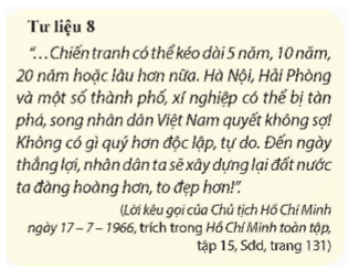Vận dụng trang 106 Lịch Sử 12: Em hãy đọc Tư liệu 8 và viết một bài cảm nhận về Lời kêu gọi của Chủ tịch Hồ Chí Minh ngày 17-7-1966 nhân dịp kỉ niệm ngày sinh của Người.