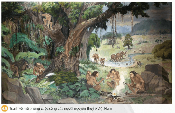 1. Quan sát hình 4.8, em hãy cho biết đời sống của người nguyên thủy ở Việt Nam (Cách thức lao động, vai trò của lửa trong đời sống của họ)