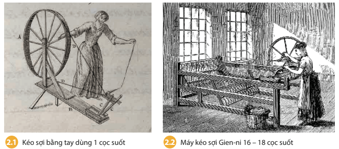 Câu hỏi trang 16 Lịch Sử 8: Từ việc quan sát hình 2.1 và hình 2.2, em hãy thảo luận cùng các bạn: máy kéo sợi Gien-ni (Jenny) đã có cải tiến quan trọng gì?