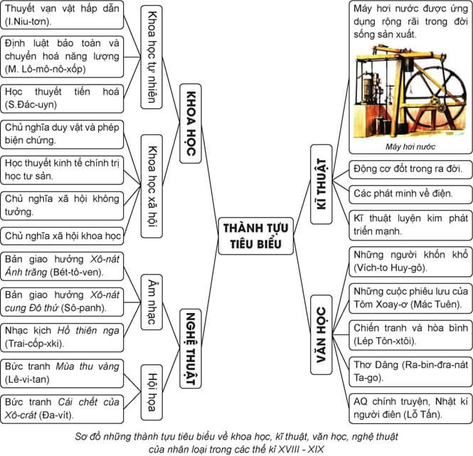 Luyện tập 1 trang 55 Lịch Sử 8: Vẽ sơ đồ tư duy thể hiện thành tựu tiêu biểu về khoa học, kĩ thuật, văn học và nghệ thuật trong các thế kỉ XVIII - XIX.