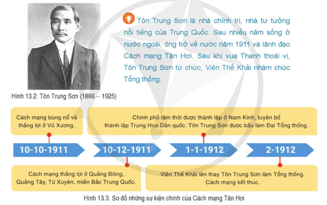 Câu hỏi trang 57 Lịch Sử 8: Đọc thông tin và quan sát các hình 13.2, 13.3, trình bày sơ lược về Cách mạng Tân Hợi và cho biết vai trò của Tôn Trung Sơn. Nêu kết quả và ý nghĩa lịch sử của Cách mạng Tân Hợi.