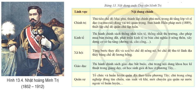 Câu hỏi trang 58 Lịch Sử 8: Đọc thông tin và quan sát hình 13.4, bảng 13, nêu nội dung chính và ý nghĩa lịch sử của cuộc Duy tân Minh Trị ở Nhật Bản.