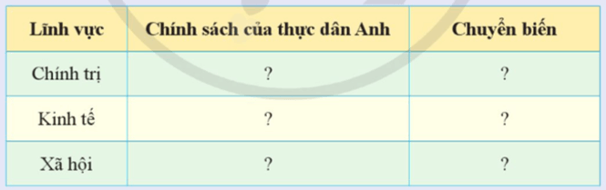 Luyện tập 1 trang 63 Lịch Sử 8: Lập bảng tóm tắt về tình hình chính trị, kinh tế, xã hội của Ấn Độ cuối thế kỉ XIX, đầu thế kỉ XX theo hai nội dung sau: chính sách của thực dân Anh và chuyển biến lớn: