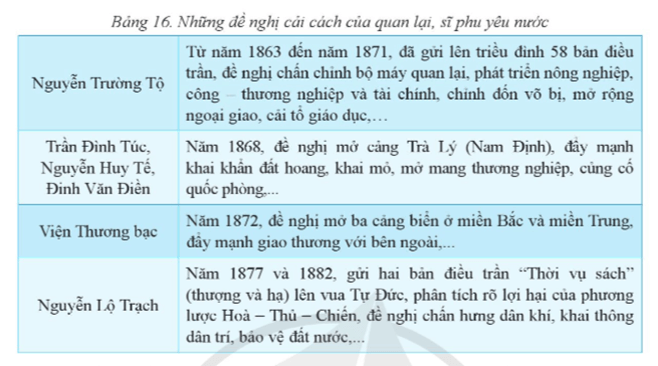 - Nêu những nội dung chính trong các đề nghị cải cách của quan lại, sĩ phu yêu nước Việt Nam cuối thế kỉ XIX.