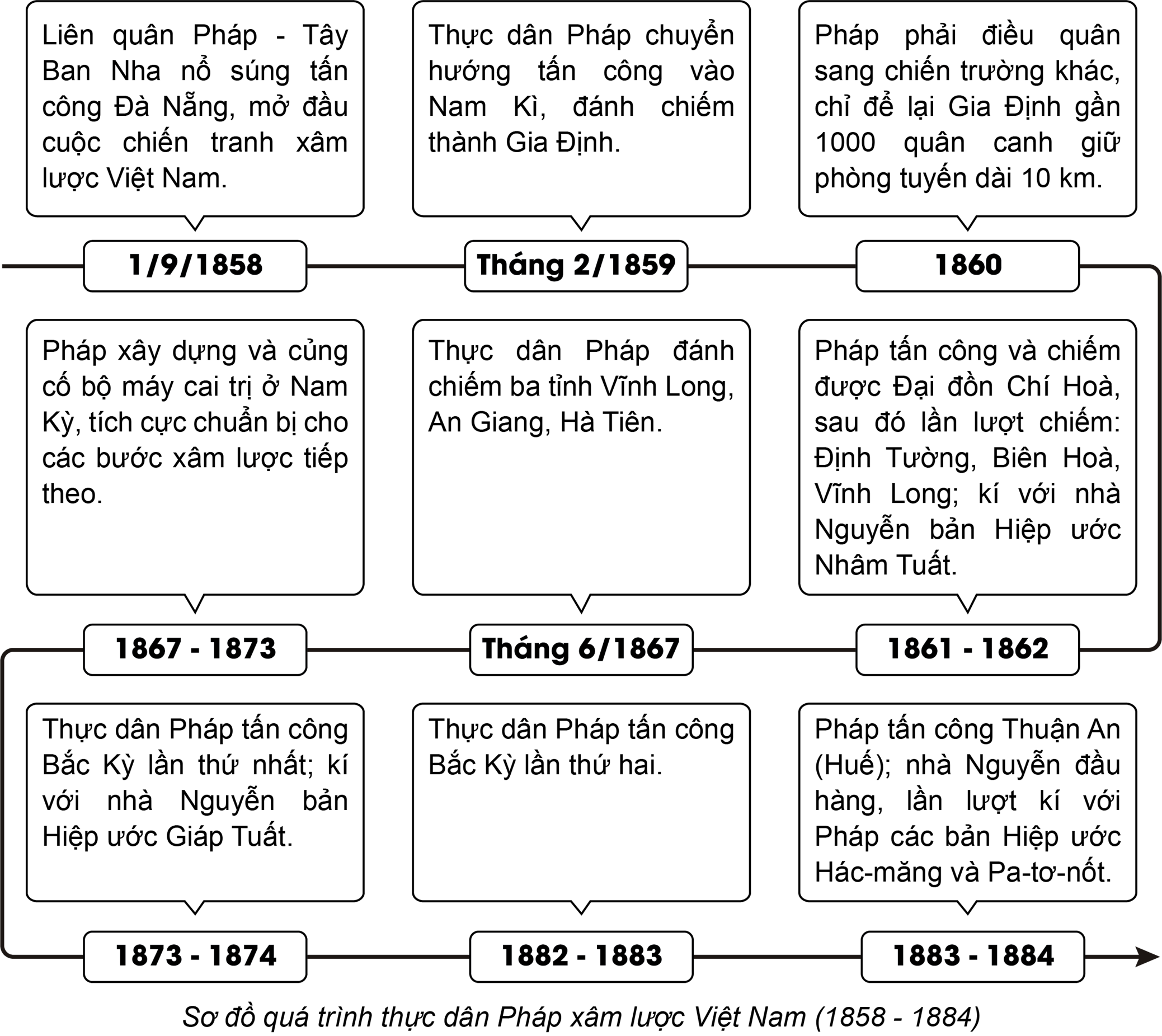 - Trong những năm 1858 - 1884, thông qua nhiều thủ đoạn chính trị, quân sự và ngoại giao, thực dân Pháp đã từng bước hoàn thành quá trình xâm lược Việt Nam.