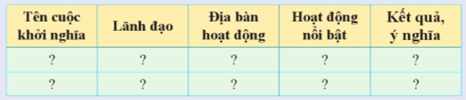 Luyện tập 2 trang 80 Lịch Sử 8: Lập bảng hệ thống kiến thức về các cuộc khởi nghĩa tiêu biểu trong phong trào Cần vương và khởi nghĩa Yên Thế theo nội dung sau: