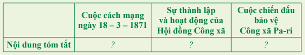 Luyện tập 1 trang 49 Lịch Sử 8: Hoàn thành bảng tóm tắt những nét chính về Công xã Pa-ri (1871) theo mẫu dưới đây: