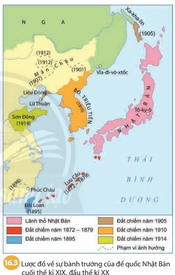 Câu hỏi trang 67 Lịch Sử 8: Quan sát lược đồ 16.3 và dựa vào thông tin trong bài, em hãy nêu những biểu hiện của sự hình thành chủ nghĩa đế quốc ở Nhật Bản vào cuối thế kỉ XX, đầu thế kỷ XX.