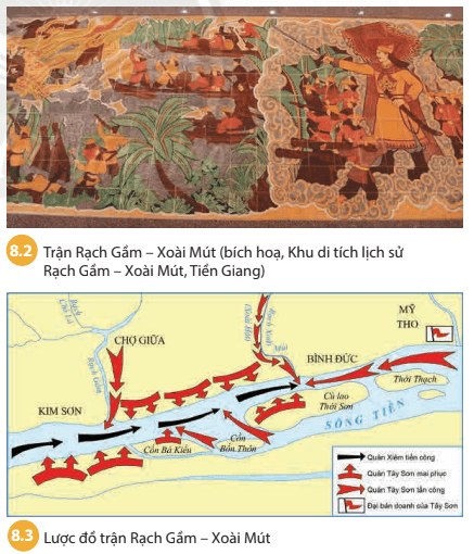 Câu hỏi trang 41 Lịch Sử 8: Dựa vào thông tin trong bài, quan sát hình 8.2 và lược đồ 8.3, em hãy mô tả lại chiến thắng Rạch Gầm - Xoài Mút năm 1785.