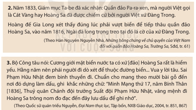 Câu hỏi 1 trang 74 Lịch Sử 8: Khai thác tư liệu 2, 3, hãy nêu những đóng góp của vua Gia Long và vua Minh Mạng trong công cuộc thực thi chủ quyền ở quần đảo Hoàng Sa và quần đảo Trường Sa.