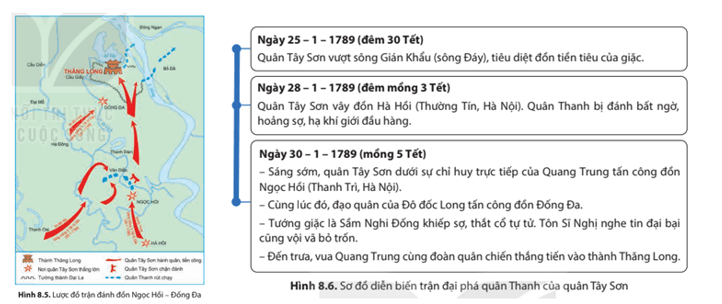 Câu hỏi trang 38 Lịch Sử 8: Khai thác hình 8.5, 8.6, hãy mô tả trận đại phá quân Thanh xâm lược năm 1789 quân Tây Sơn.