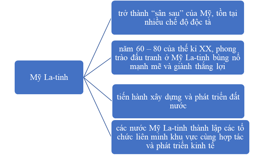 - Sau Chiến tranh thế giới thứ hai, các nước Mỹ La-tinh trở thành "sân sau" của Mỹ, tồn tại nhiều chế độ độc tài. Năm 1959, cách mạng Cu-ba giành thắng lợi bằng đấu tranh vũ trang. Sự kiện này có tác động lớn đến các nước trong khu vực. Những năm 60 - 80 của thế kỉ XX, phong trào đấu tranh ở Mỹ La-tinh bùng nổ mạnh mẽ và giành thắng lợi. Mỹ La-tinh được ví như "Lục địa bùng cháy".