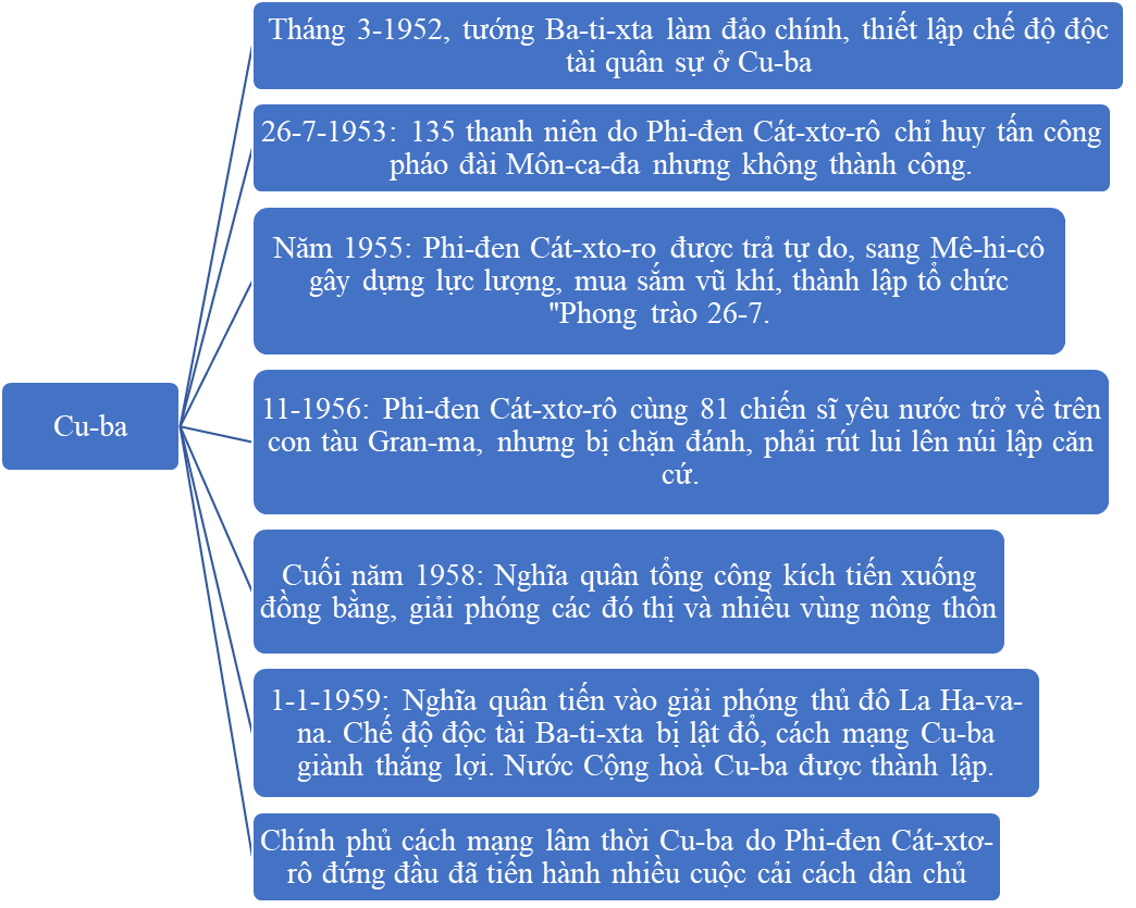 - Ngày 1/1/1959: Nghĩa quân tiến vào giải phóng thủ đô La Ha-va-na lật đổ chế độ độc tài Ba-ti-xta. Cách mạng Cu-ba giành thắng lợi. Nước Cộng hòa Cu-ba được thành lập.