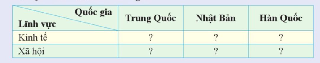 Câu 1: Lập bảng thống kê về sự phát triển kinh tế – xã hội của Trung Quốc, Nhật Bản, Hàn Quốc theo mẫu sau vào vở ghi.