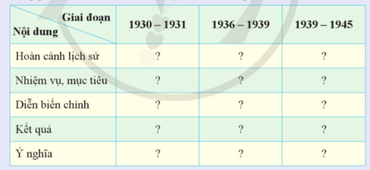 Lập bảng tóm tắt những sự kiện chính của phong trào cách mạng Việt Nam trong giai đoạn 1930 – 1945 theo mẫu sau vào vở ghi.