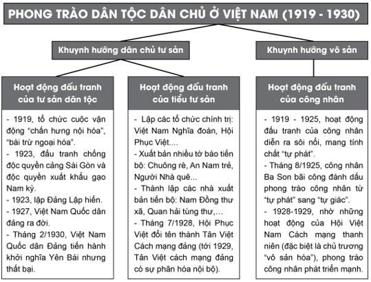 Luyện tập 1 trang 25 Lịch Sử 9: Vẽ sơ đồ thể hiện những sự kiện tiêu biểu trong phong trào dân tộc dân chủ từ năm 1918 đến năm 1930 ở Việt Nam.