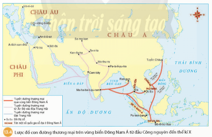 Dựa vào lược đồ 13.4, đối chiếu với bản đồ 12.1, em hãy cho biết con đường thương mại ở Đông Nam Á đi qua những vùng biển, đại dương nào ngày nay?