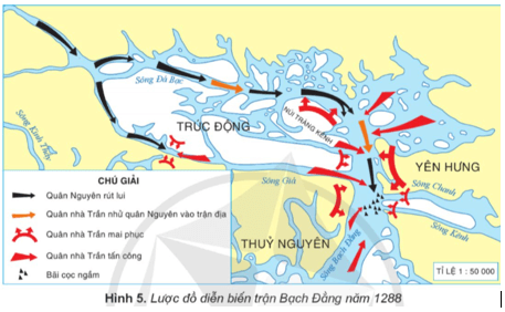 - Ngày 9-4-1288, đoàn thuyền của quân Nguyên đến sông Bạch Đằng. Nhân lúc nước triều lên, Hưng Đạo Đại Vương cho quân ra khiêu chiến rồi giả vờ thua chạy. Quân Nguyên dẫn binh thuyền đuổi theo. Nước triều xuống, thuyền giặc sa vào bãi cọc. Phục binh của quân nhà Trần đổ ra đánh cùng với quân tiếp ứng. Quân Nguyên bị tiêu diệt.