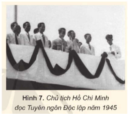 • Đọc thông tin và quan sát hình 7, em hãy kể lại câu chuyện Chủ tịch Hồ Chí Minh viết và đọc bản “Tuyên ngôn Độc lập".