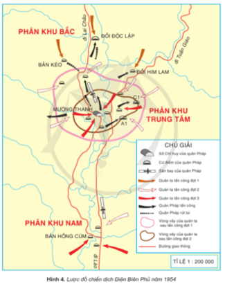Luyện tập 1 trang 71 Lịch sử và Địa lí 5: Sử dụng lược đồ hình 4, tóm tắt diễn biến chính của chiến dịch Điện Biên Phủ bằng đường thời gian.