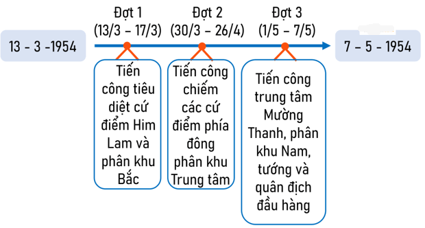 + Đợt 3 (1/5-7/5): Tiến công vào trung tâm Mường Thanh và phân khu Nam, chiều 7/5 tướng Đờ Ca-xtơ-ri và quân địch đầu hàng, chiến dịch kết thúc thắng lợi.