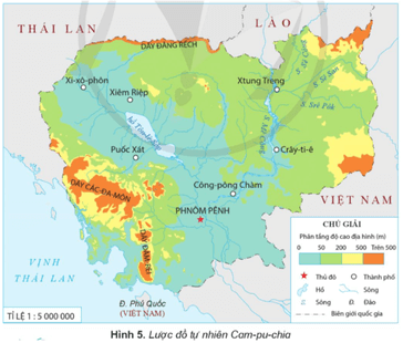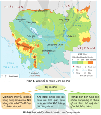 • Quan sát các hình 5, 6, em hãy trình bày một số đặc điểm cơ bản về tự nhiên của Cam-pu-chia.