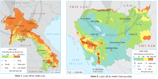a) Kể tên kết hợp chỉ trên lược đồ (hình 1 hoặc hình 5) một số dãy núi, cao nguyên, sông lớn của Lào và khu vực đồng bằng, một số dãy núi, sông lớn của Cam-pu-chia.