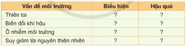 2. Hoàn thành bảng để phân biệt một số vấn đề môi trường theo gợi ý dưới đây vào vở ghi.