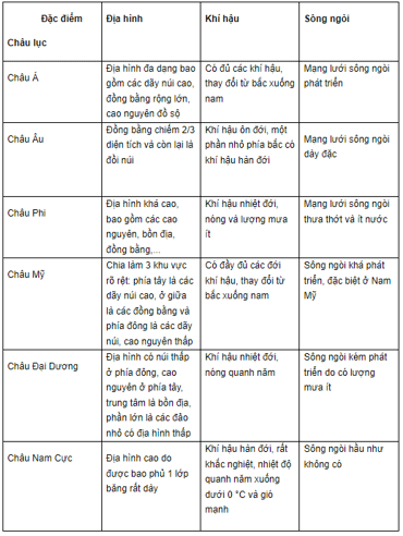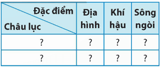 Luyện tập 1 trang 88 Lịch sử và Địa lí 5: Lựa chọn hai châu lục đã học để hoàn thành bảng thông tin so sánh sự khác nhau về đặc điểm địa hình, khí hậu và sông ngòi theo mẫu vào vở: