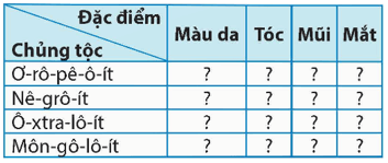 Luyện tập 2 trang 91 Lịch sử và Địa lí 5: Hoàn thành bảng thông tin về một số đặc điểm ngoại hình của bốn chủng chính trên thế giới theo mẫu vào vở: