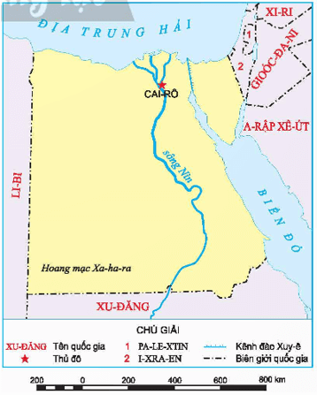 + Phía bắc Ai Cập giáp Địa Trung Hải, phía đông bắc giáp I-xra-en (Israel), phía đông giáp Biển Đỏ, phía nam giáp Xu-đăng (Sudan) và phía tây giáp Li-bi (Libya).