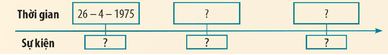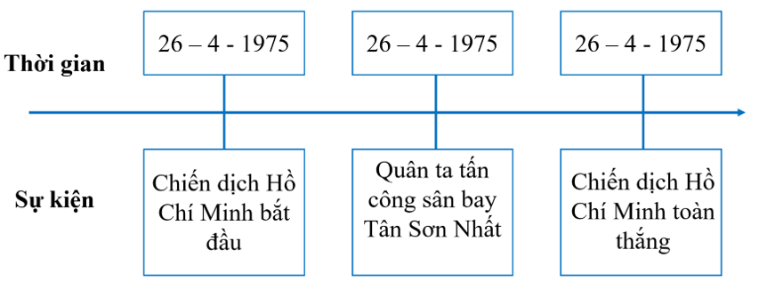 Luyện tập 1 trang 71 Lịch sử và Địa lí lớp 5: Hoàn thiện trục thời gian (theo gợi ý dưới đây vào vở) về một số sự kiện lịch sử trong Chiến dịch Hồ Chí Minh năm 1975.