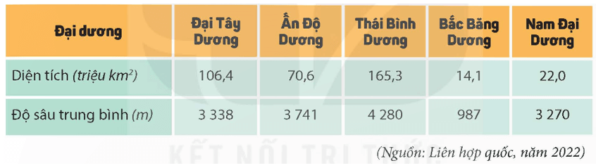 BẢNG 2. DIỆN TÍCH VÀ ĐỘ SÂU TRUNG BÌNH CỦA CÁC ĐẠI DƯƠNG TRÊN THẾ GIỚI