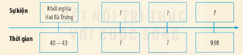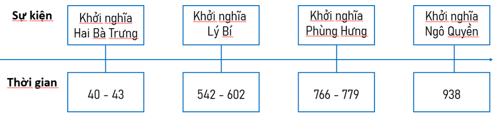 Luyện tập 1 trang 39 Lịch sử và Địa lí lớp 5: Hãy vẽ và hoàn thiện trục thời gian (theo gợi ý dưới đây vào vở) thể hiện một số cuộc đấu tranh tiêu biểu trong thời kì Bắc thuộc.