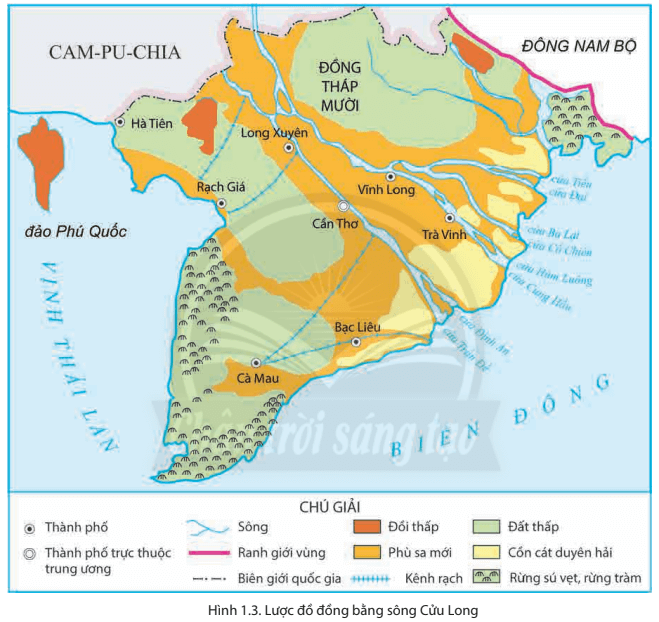 Câu hỏi trang 159 Lịch Sử và Địa Lí 8: Dựa vào hình 1.3 và thông tin trong bài, em hãy trình bày quá trình hình thành và phát triển châu thổ sông Cửu Long.