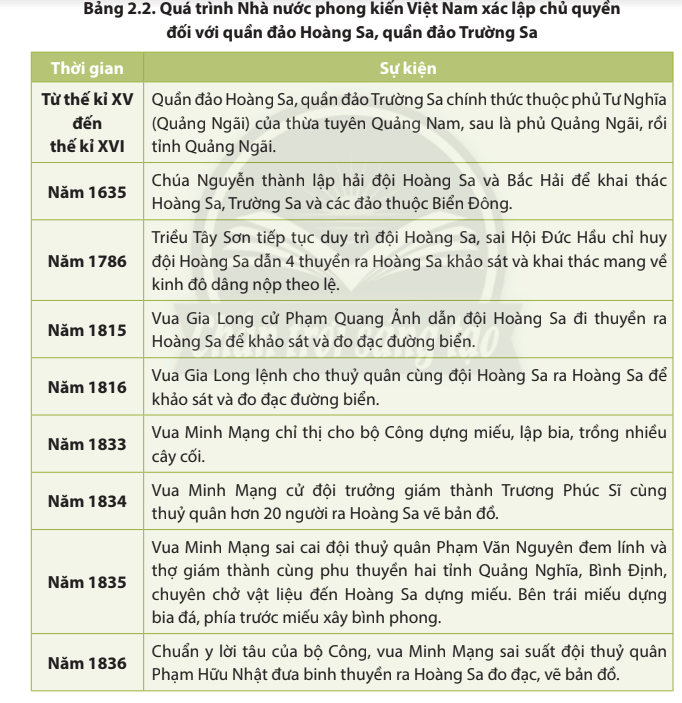 Câu hỏi trang 166 Lịch Sử và Địa Lí 8: Từ bảng 2.2, đoạn tư liệu và thông tin trong bài, em hãy cho biết Nhà nước Việt Nam qua các thời kì lịch sử đã có những hành động nào để khẳng định chủ quyền đối với quần đảo Hoàng Sa, quần đảo Trường Sa.