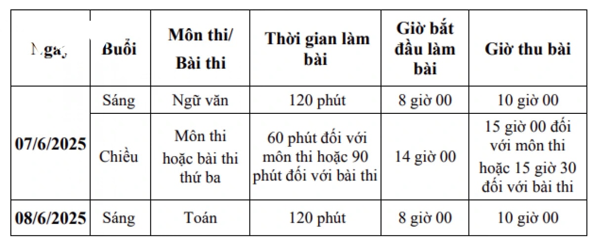 Số môn thi, bài thi gồm: Toán, Ngữ văn và 1 môn thi hoặc bài thi thứ ba do Sở Giáo dục và Đào tạo lựa chọn 1 trong 2 phương án sau:
