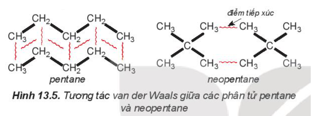 Ví dụ 2: Pentane là hydrocarbon no có công thức C5H12. Đồng phân mạch không phân nhánh pentane có nhiệt độ sôi (36oC) cao hơn so với đồng phân mạch nhánh neopentane (9,5oC) do diện tích tiếp xúc giữa các phân tử pentane lớn hơn nhiều so với neopentane.