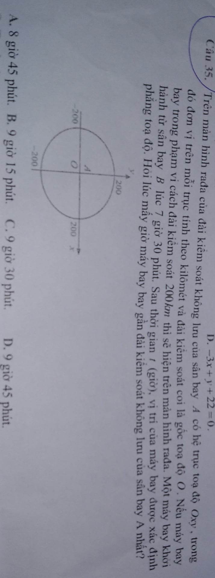 Trên màn hình ra đa của một đài kiểm soát không lưu của sân bay A có hệ trục tọa độ Oxy, trong đó đơ vị trên mỗi trục tính theo kilomet và đài kiểm soát coi là gốc tọa độ O. Nếu máy bay bay trong phạm vi cách đài kiểm soát 200 km thì sẽ hiện trên màn hình ra đa. Một máy bay khởi hành từ sân bay B lúc 7 giờ 30 phút, sau thời gian t, vị trí của máy bay được xác định phẳng tọa độ. Hỏi Lúc mấy giờ máy bay bay gần đài kiểm soát không lưu của sân bay A nhất?