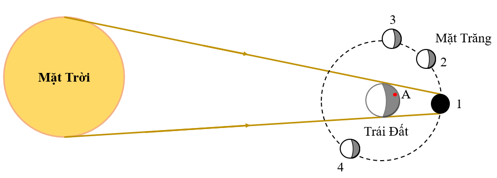 Mặt Trăng ở vị trí nào thì người đứng ở điểm A trên Trái Đất có nguyệt thực?
