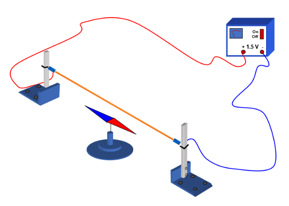 Cung cấp điện vào hai đầu của đoạn dây dẫn, đặt kim nam châm sao cho trục của kim nam châm song song với trục của dây dẫn. Khi đóng mạch điện có hiện tượng gì xảy với kim nam châm?